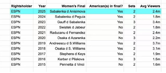 比如,2017年纳达尔对阵安德森,以及2020年小兹维列夫迎战蒂姆,这两场男单决赛的收视率就比较低,只有150万;女单的最低收视率保持者是科贝尔和普利斯科娃,两人在2016年的那场女单对决收视率也只有150万,甚至还没有2015年佩内塔和文奇的收视率高,让人有些意外!
