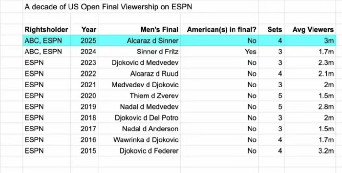 在这份收视率名单公布后,还发生了一件让人意想不到的事情。有知情人士对外透露,今年辛纳和阿尔卡拉斯对决的收视率看似飙到了300万,是件喜大普奔的事情,但是赞助商们认为,这一数据理应更高,人们获得的收益更大,可惜他们最期待的争冠阵容没有出现。